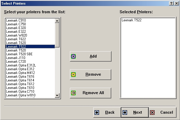 Click on the "Lexmark T522" printer, add it to the selected printers