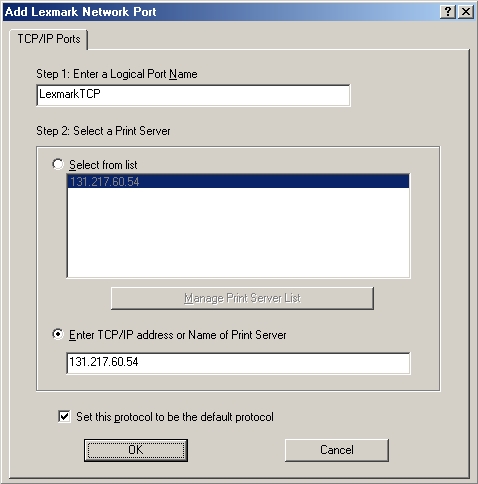 printers address. Click the default protocol box if you